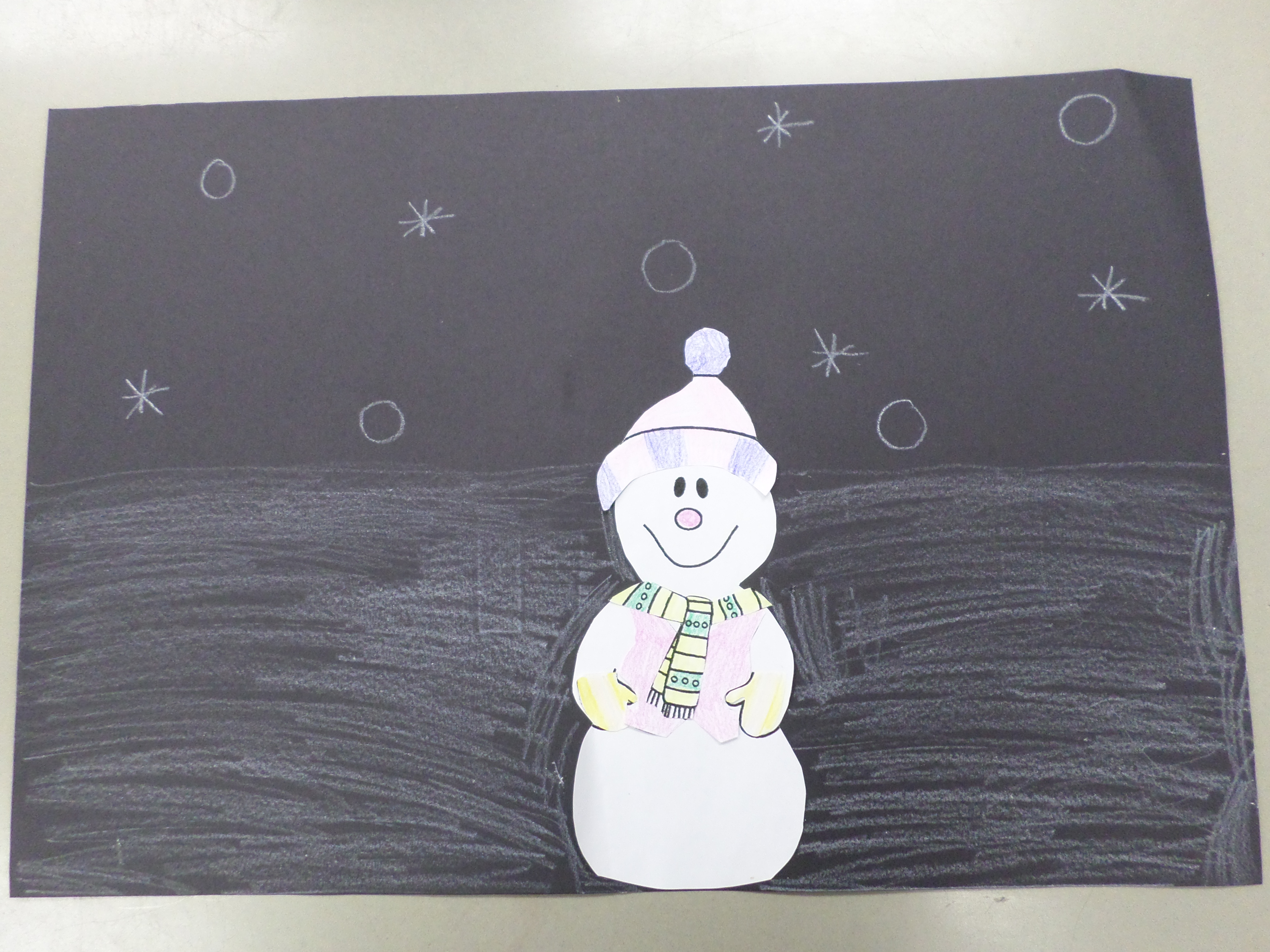 After they finished labeling their snowmen I had them turn their papers to the other side and they made a snow picture with a snowman worksheet. The purpose of this wasn’t the cut and paste snowman but using a horizon in the picture. We have been talking about drawing pictures with a horizon to give the picture some depth and to correspond with their lesson with the art teacher and vanishing points.