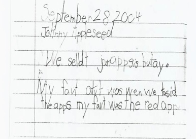 One of my favorite examples of watching a child to naturally mature in to a writer was a 1st grade girl that entered into my class with very few writing skills. In late September, after being in school for over a month, it was time to celebrate Johnny Appleseed’s birthday. We watched the Disney movie, peeled apples using an apple peeler, measured the length of the apple peels, tasted red, green and yellow apples, and made apple crisp. Later they wrote about the experience in their journals.