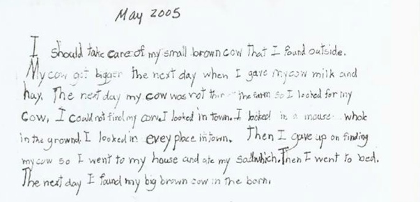 Once upon a not too distant time I had a parent who felt her first grader should be taught only second grade work. She felt he was way beyond our first grade curriculum and as proof she brought to our conference a paper he had written in kindergarten. Keep in mind that I had been working with this child for a few weeks and knew his writing style which included, at that point in time, no capitalization or punctuation and sprinkled in were some misspelled words. What she shows me is this beautifully written story with no mistakes. There was nothing in his present work to indicate that he had written the story by himself. It looked as if he had dictated it to someone and they in turn sat by him and told him exactly what to write so it looked like a masterpiece. It gave a false indication of his level of work and his level of developement. It isn’t the first time I’ve seen this done.
